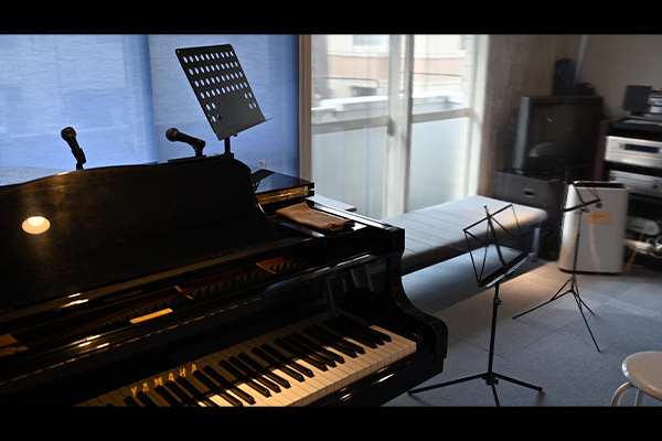 グランドピアノが設置された本格的な広々としたスタジオです。